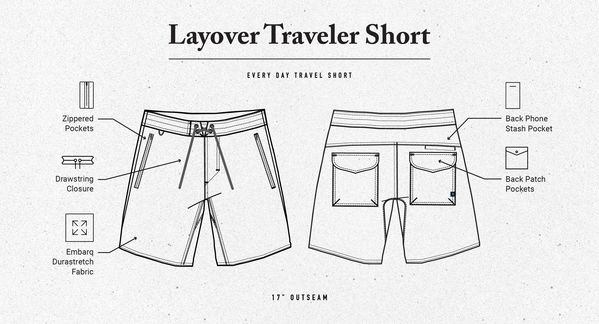 Unsere neue, inspirierte 17"-Hybrid-Abenteuershort ist jetzt aus 4-Wege-Stretch gefertigt und bietet eine schnell trocknende, langlebige Erfahrung für jedes Abenteuer. Die neueste Layover Trail Short verfügt über einen Kordelzug am Bund mit Reißverschluss und einer Reißverschlusstasche vorne, eine aufgesetzte Rückentasche mit Knopfverschluss und eine kleine Tasche an der hinteren Passe zur schnellen Aufbewahrung von Handys.